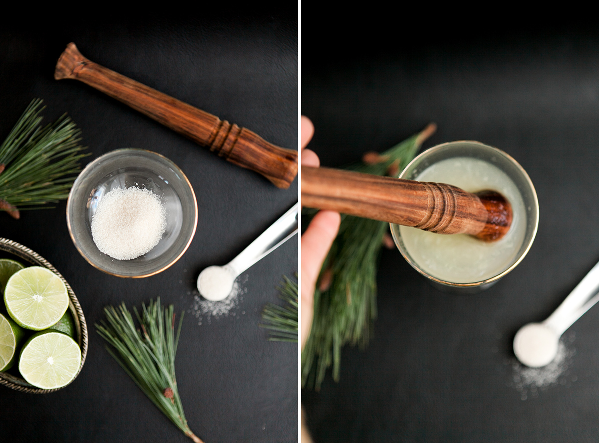 - Add raw sugar and fresh lime juice into a glass and muddle.